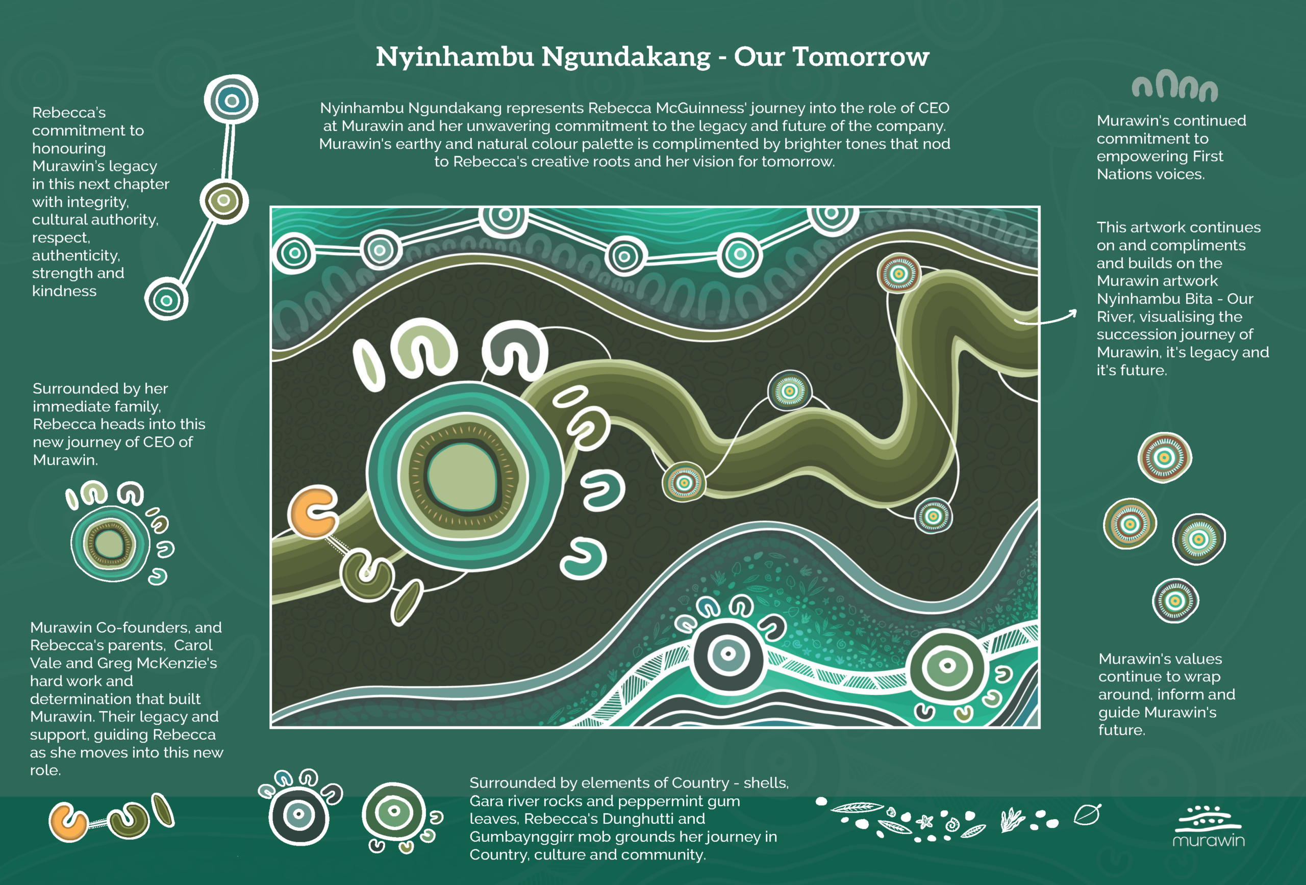 As a part of the Murawin succession story, our resident designer and digital artist Wallula Bethell created Nyinhambu Ngundakang – Our Tomorrow as a powerful visual expression of Rebecca’s story and her transition to CEO. This process isn’t just about recording the family and company story in ways that go beyond words, it also shows the depth, creativity, and strength of what we at Murawin can produce in‑house. It reflects the kind of meaningful, beautiful work we want to share with our clients, our communities, and our mob.