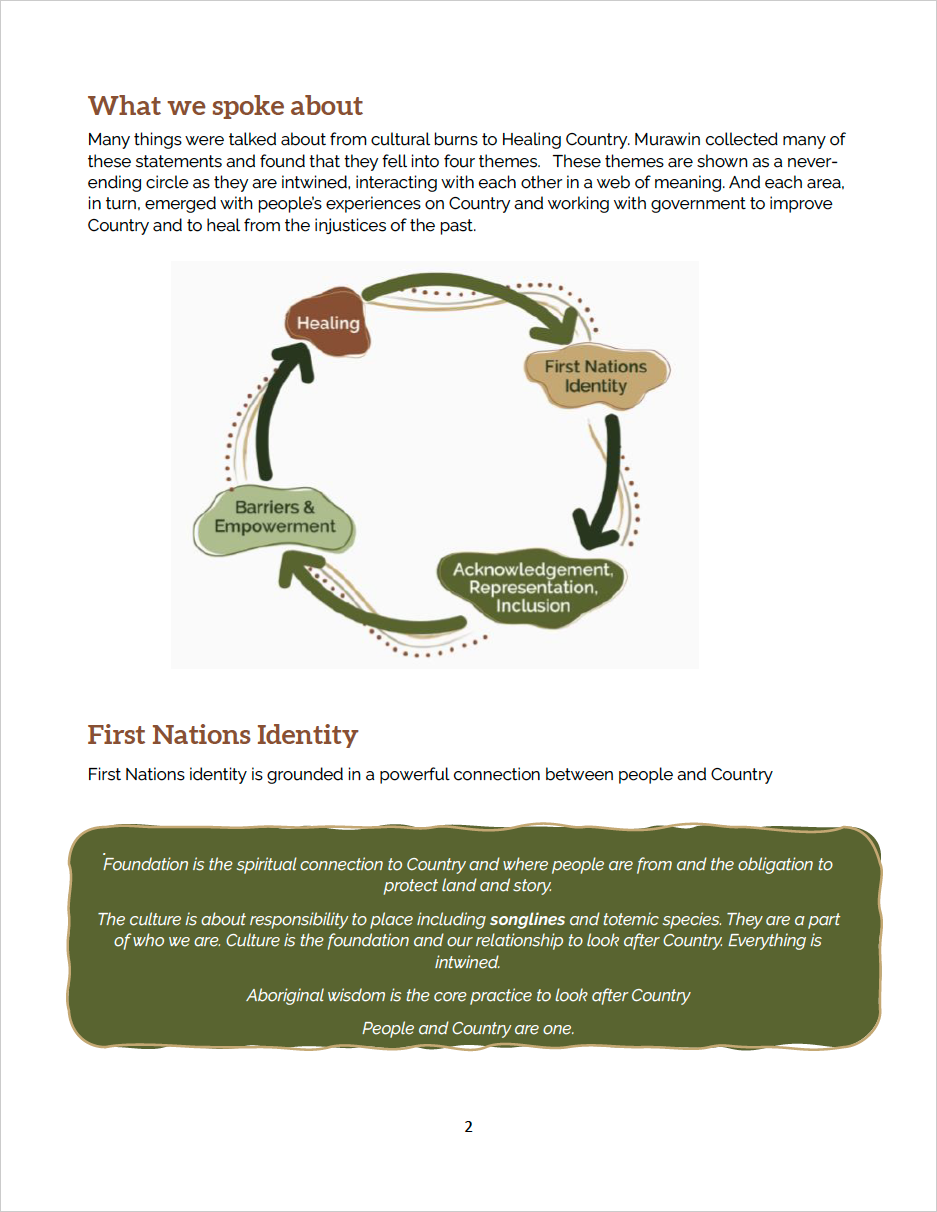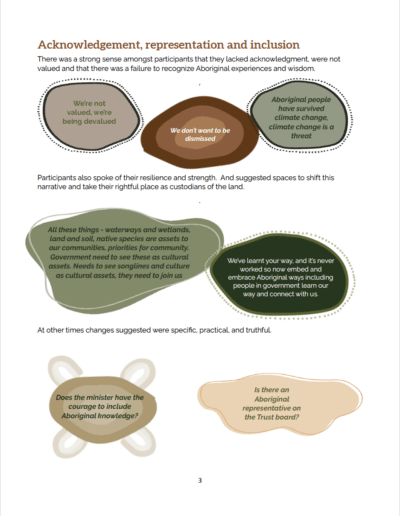 Murawin is proud to have used our engagement expertise to support the Trust to deliver the Connecting to Aboriginal Cultural Landscapes Workshop. The key to the success of the workshop lay in maintaining a culturally safe environment for participants to express their thoughts and feelings in an organic and meaningful yarn format. In delivering the report, Murawin wanted to reflect this format directly in the report, taking a storytelling approach over a detail-oriented style.